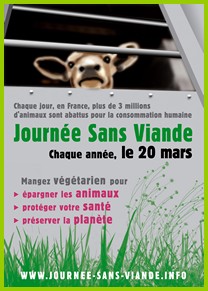 Manifestation annuelle organisée par l’organisation américaine FARM, la Journée Sans Viande (campagne MeatOut en anglais) est une campagne internationale destinée à encourager une évolution vers un régime éthique et équilibré à base de fruits, de légumes et de céréales en faisant la promotion du large choix d’alternatives à la viande. Chaque année sont organisés partout dans le monde des stands de dégustation de délicieuse nourriture sans cruauté envers les animaux, des actions d’information sur les différentes motivations éthiques pour ne plus manger de viande, des conférences, des cours de cuisine ou des repas sans viande partagés avec des proches, des voisins ou des collègues. (Source : JVS)